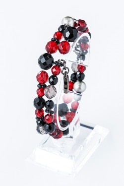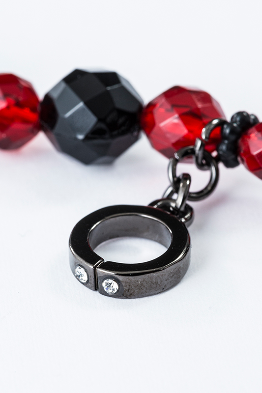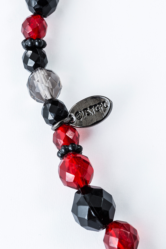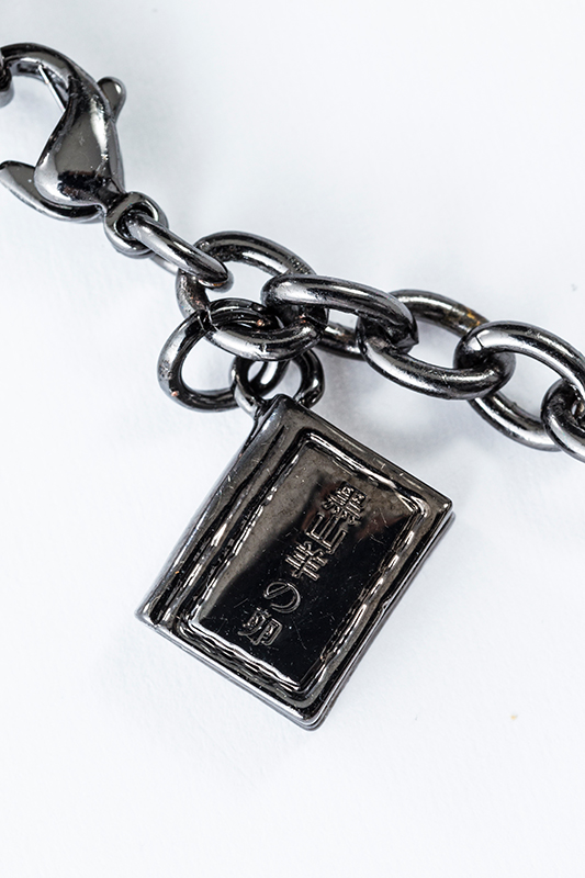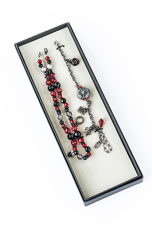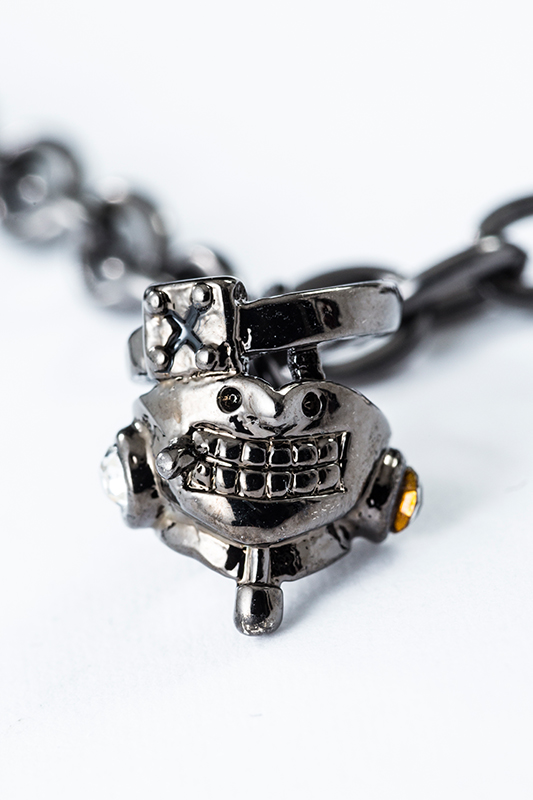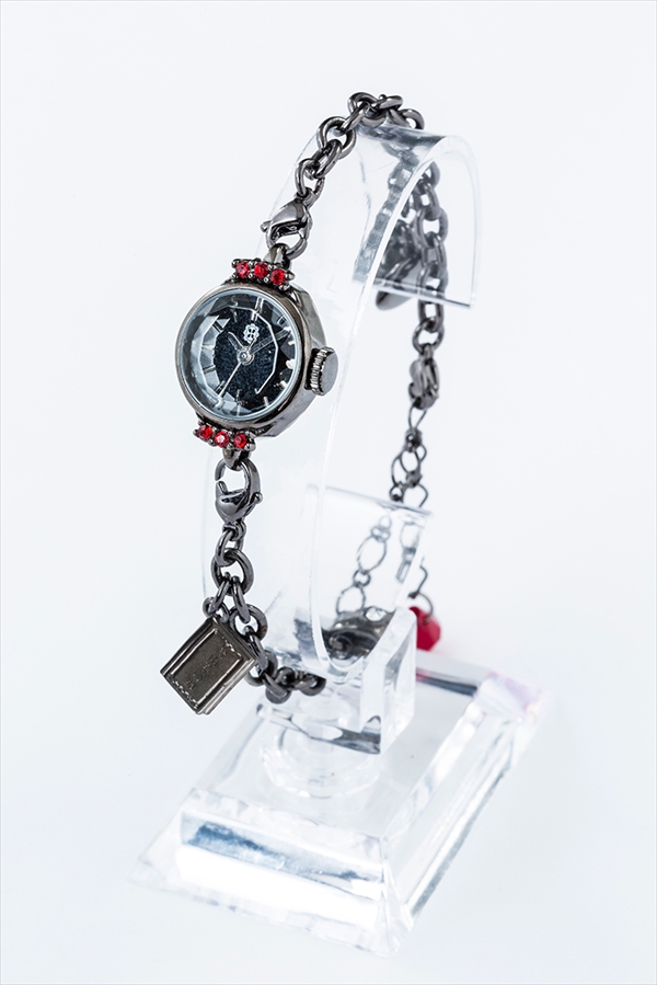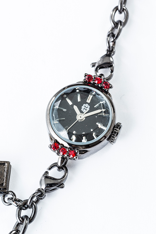 金木モデルのリストウォッチには、彼の愛読書である『黒山羊の卵』や、喰種のマスク、そしてあんていくのティーカップといったモチーフが、さりげなく付いている。金木の赫眼をイメーシした赤いクリスタルが映えるデザインだ。なお、ベルト部分は付属のビーズブレスレットに付け替えることも可能。このブレスレットには、捕らわれた金木を連想させる手錠モチーフが付いており、覚醒した金木が表現されている。