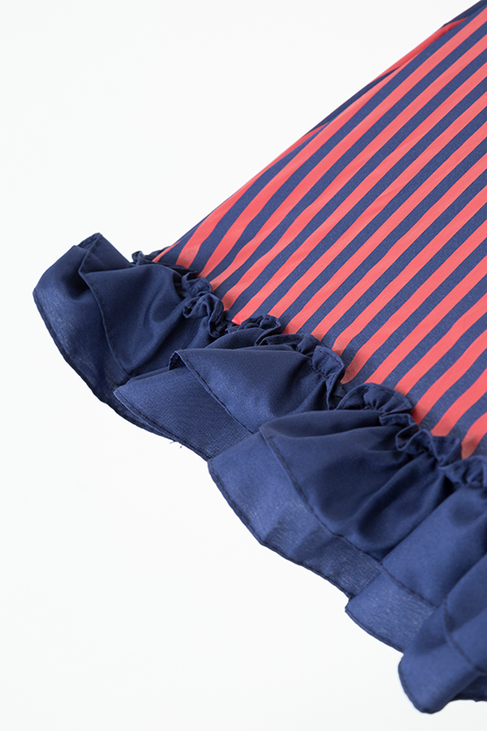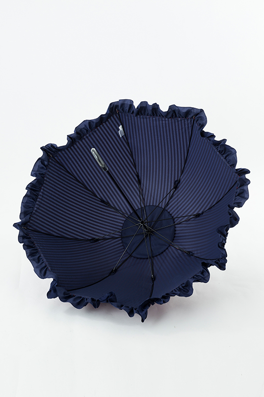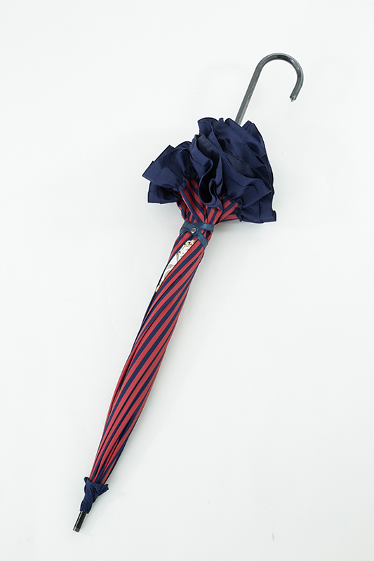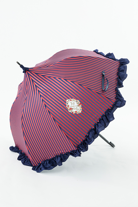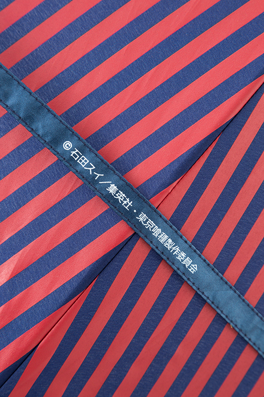 月山モデルの傘は、赤と黒のストライプに黒いレースがついたゴタパ風な逸品。留め具の部分は、月山の赫子をイメージした仕様となっている。また、月山を思わせるバラと美食家、そして喰種マスクのモチーフである三日月をコラージュしたエンブレムが、プリントされている。
