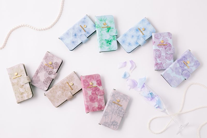 秋組と冬組の劇団員10人をイメージした手帳型スマホケースが登場。各キャラクターのモチーフフラワーとイメージカラーが、パステルトーンの花柄デザインで表現されている。