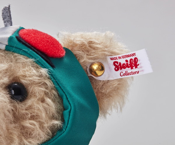 左耳には、シュタイフのテディベアである証‟ボタン・イン・イヤー”と限定商品であることを表すタグが付いている。1,500個の数量限定である本商品のタグには、赤文字で生産年度、製造品番(シリアルナンバー)が刻まれている。