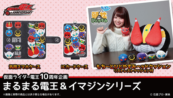 今回のグッズは、電王のマスクを丸くデフォルメした『まんまる電王もち~とひとやすみヘッドクッション イマジンリストレストクッション付』と、電王に加え敵怪人のイマジン達のマスクも丸くデフォルメしてデザインした『汎用スマホケース』、『ICカードケース』の3種類だ。