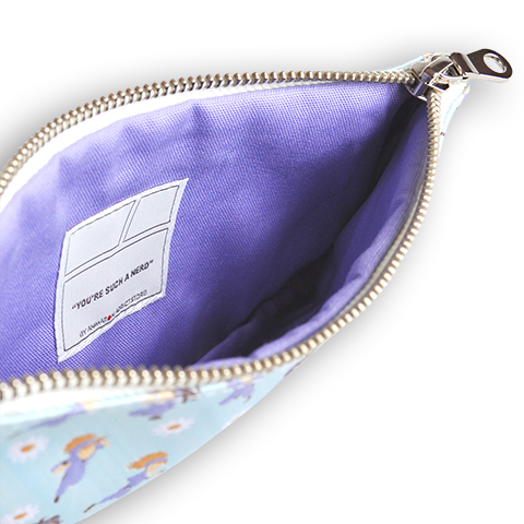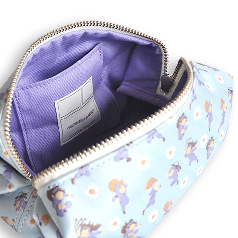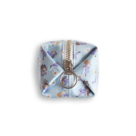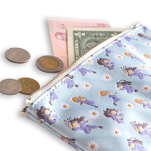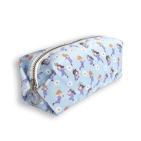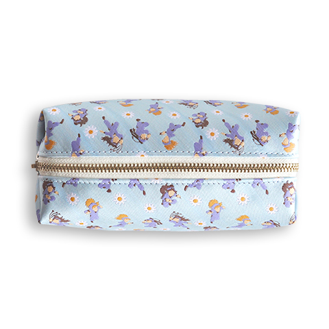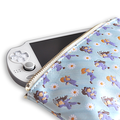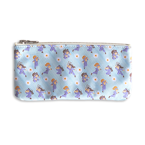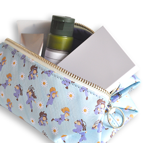 グッズのラインナップは、スクエアポーチ、ペンケース、パスポーチ、キーケースの4種。ジャカードの生地は、老舗ネクタイ生地メーカー協力の下、颯爽と跳びまわる五年生たちや繊細な花柄が織り込まれている。