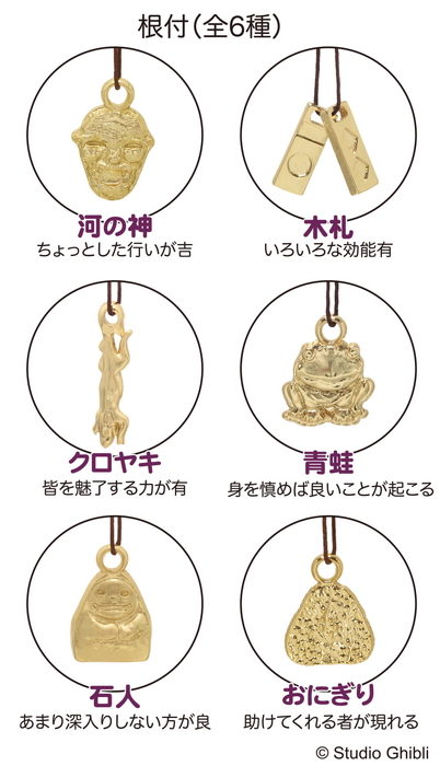 3種のさまざまな表情を見せる手のひらサイズのカオナシの中に、まるでカオナシが出現させた金塊のような、黄金に輝く根付がランダムで入っている。根付は“木札”や“石人”、“おにぎり”など全6種。作品に登場するキャラクターやアイテムがモチーフになっており、何が出るかは開けてからのお楽しみだ。