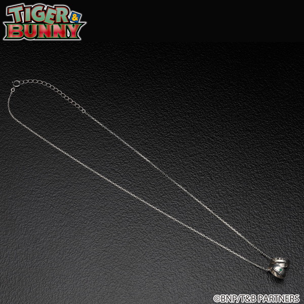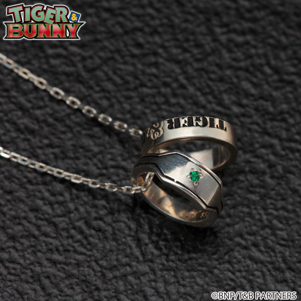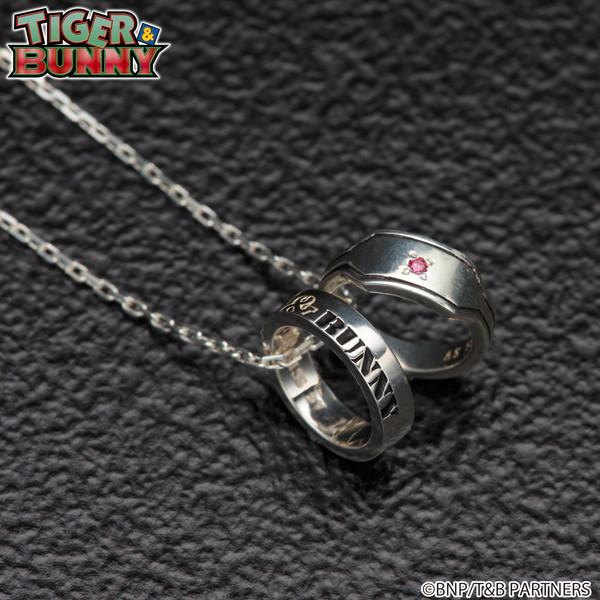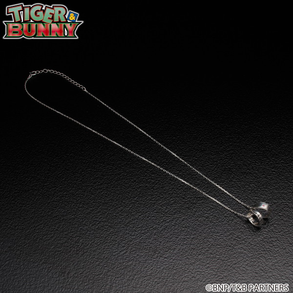 2種のリングが付いた普段使いできるネックレス。作中で、街を守るヒーローが手首に付けているPDA(ブレスレット型通信機)の形状をしたリングと、『TIGER & BUNNY』の文字が黒いぶしでデザインされたリングの2連デザイン。小さめのネックレストップに短めのチェーンを合わせることで、トレンド感が演出されている。
