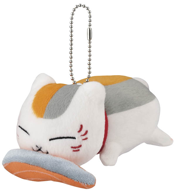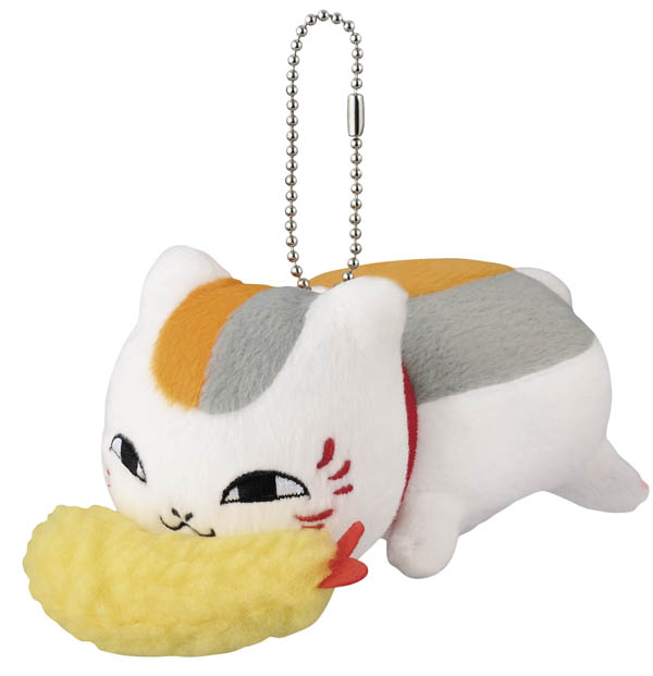エビフライとシャケをくわえて幸せそうなニャンコ先生のぬいぐるみマスコット。