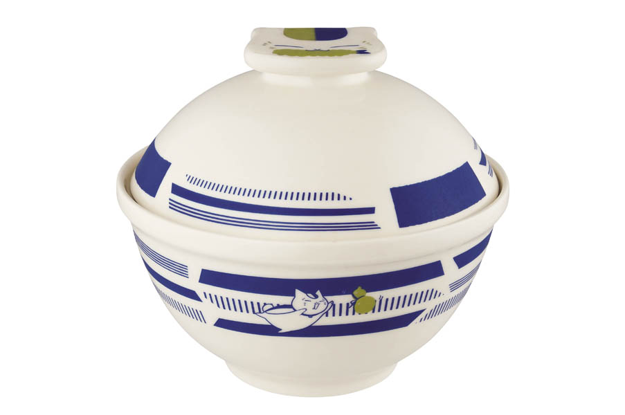 ニャンコ先生をモチーフにした、オリジナル形状の蓋付きどんぶり。食いしんぼうのニャンコ先生にちなんだ、大きめサイズで、最後のくじを引くとその場でもらえます。