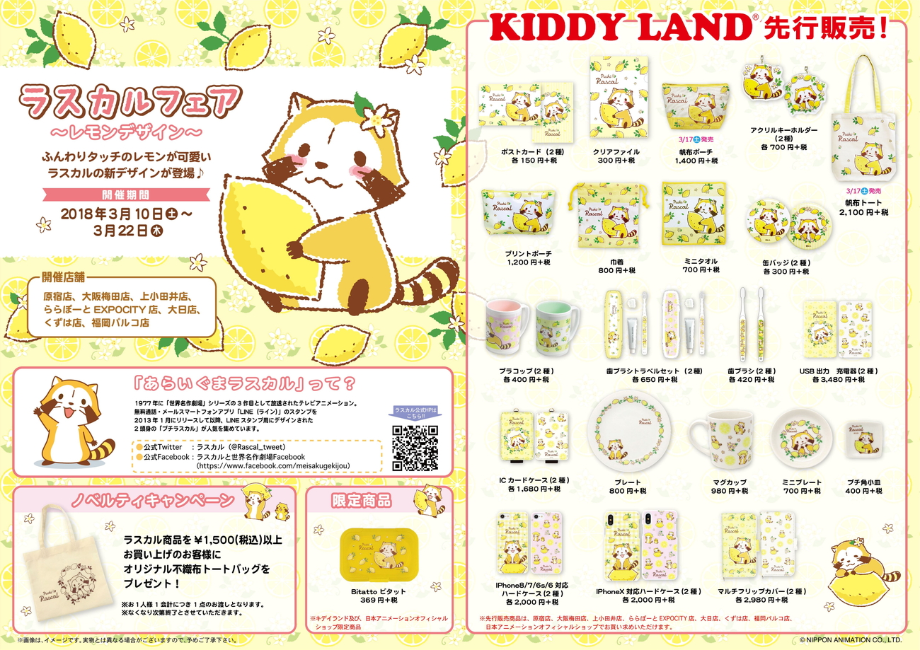 なおレモンデザイングッズは、“ラスカルフェア~レモンデザイン~”を実施するキデイランド7店舗、そして東京・池袋の日本アニメーションオフィシャルショップ ANi★CUTE(あにきゅーと)での先行発売となり、一般発売は3月24日(土)から順次展開予定だ。