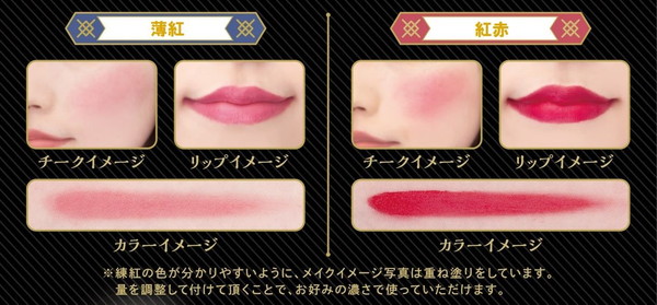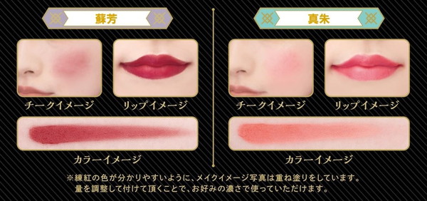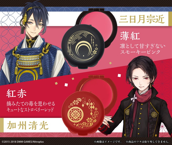 チークにもリップカラーにも使えるクリーミーで伸びの良い練紅は、4種の美容成分(保湿:ヒアルロン酸Na、カミツレ花エキス、スクワラン エモリエント:ヒマワリ種子油)を配合し、メイクをしている間、お肌や唇に潤いと艶を与えてくれるとのこと。見た目だけでなく実用性も高い逸品だ。なお、本商品は、刀剣男士のイメージカラーを配した特製ボックスに入れて届けられる。