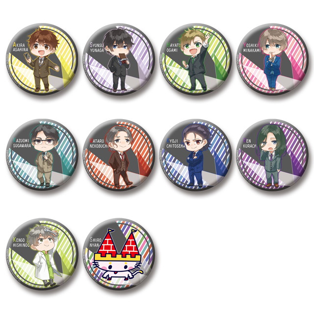 社員たちの外勤時コーディネートの缶バッジが登場。ビシッとキメたスーツ姿であなたの所にもお伺い♪ 社長とシロにゃんにゃも応援している。
