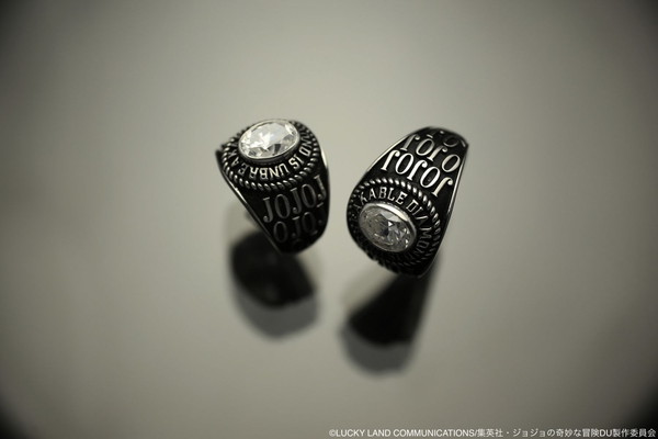 JAM HOME MADEのマスターピース、0010カレッジリングをベースに作製したリング。通常のカレッジリングでは学校名や卒業年度を記すベゼル周り(宝石をはめている溝の部分)に、第4部のサブタイトルである“DIAMOND IS UNBREAKABLE(ダイヤモンドは砕けない)”が刻まれ、側面には“JOJO”のアルファベットを配置。