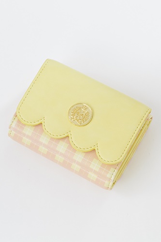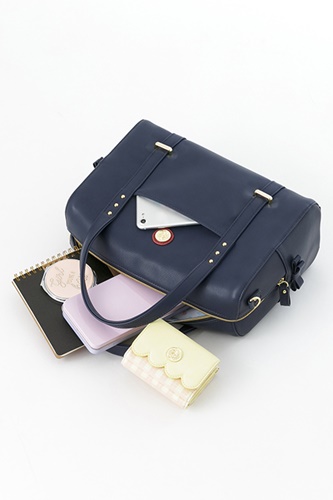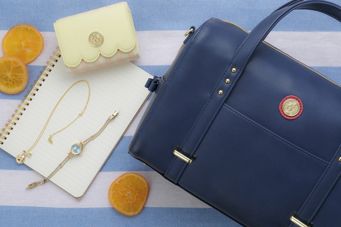 “恋の青春手帳”をイメージしたバッグには、光希や遊が通う“私立桐稜大学附属高等学校”の校章モチーフのプレートをトッピング。財布にも校章のプレートがあしらわれ、ママレードの瓶をイメージしたチェック柄&スカラップカットのフラップなどで作品らしいアイテムに仕上げられている。