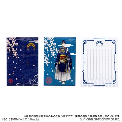 みに手紙せっとの便せんには、表面に刀剣男子の紋、裏面には和風な背景に立つ刀剣男子の姿がデザインされており、封筒も付いている。
