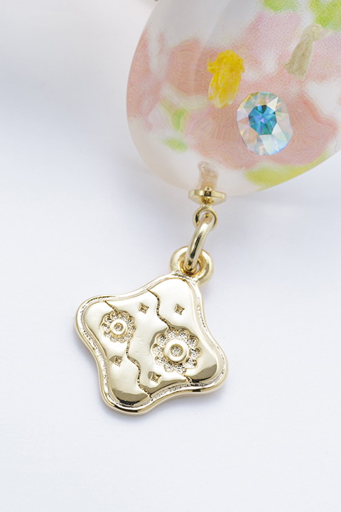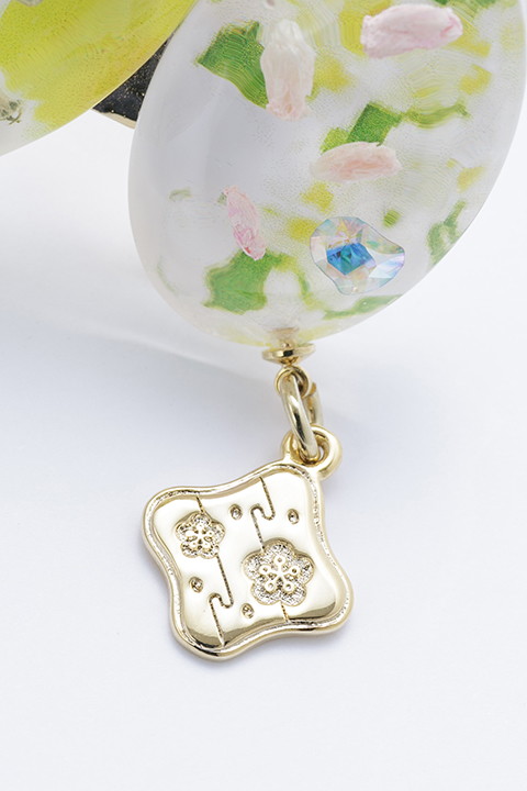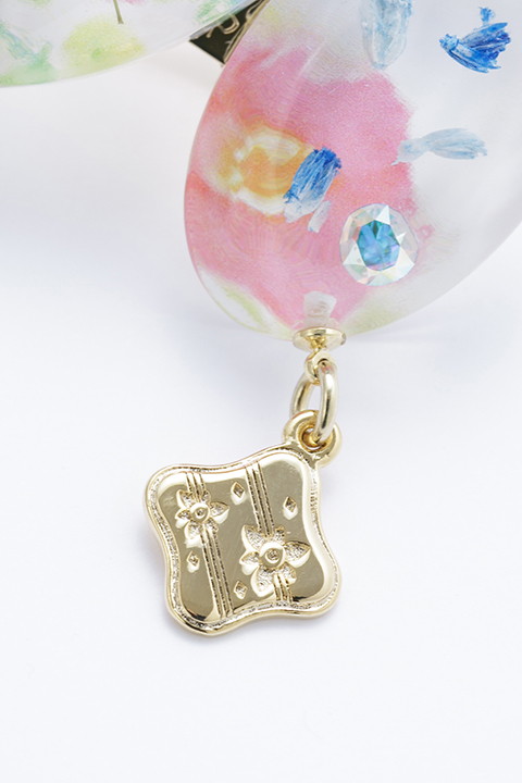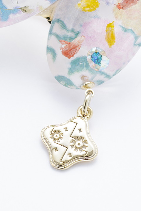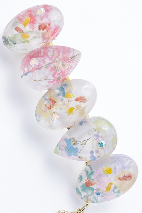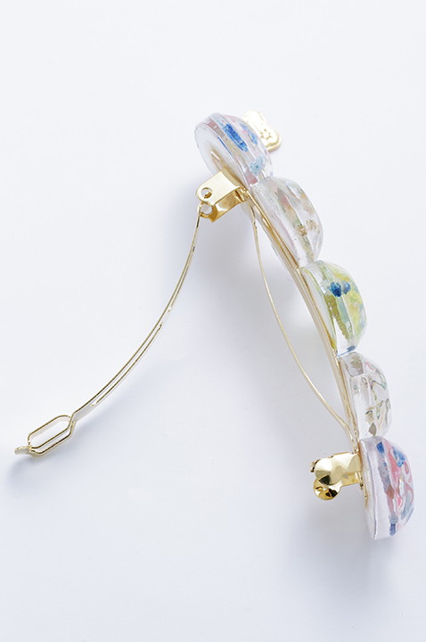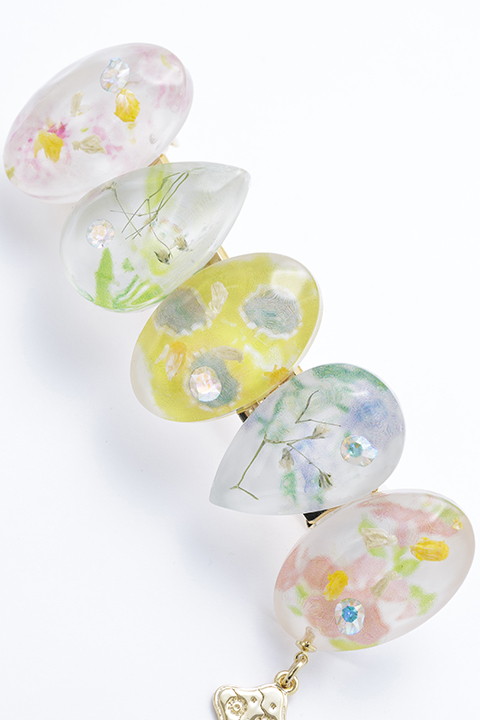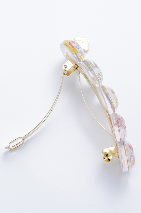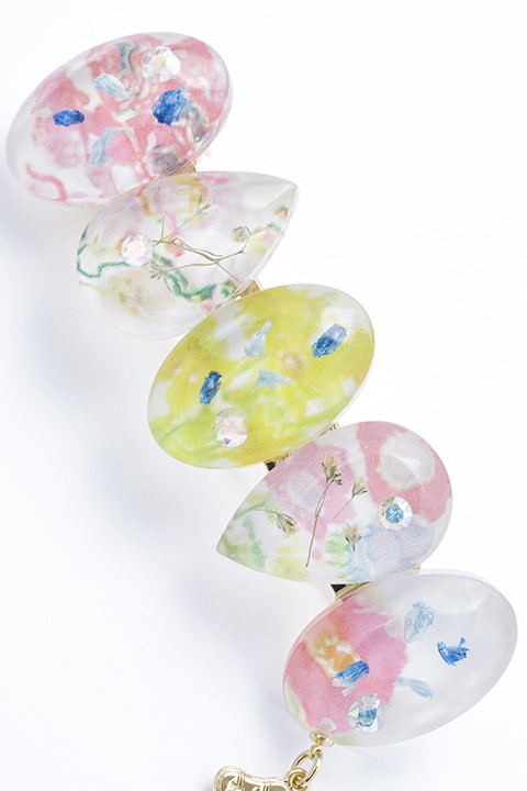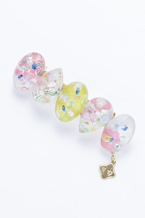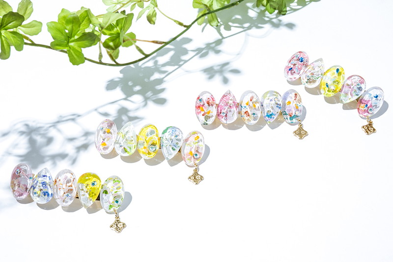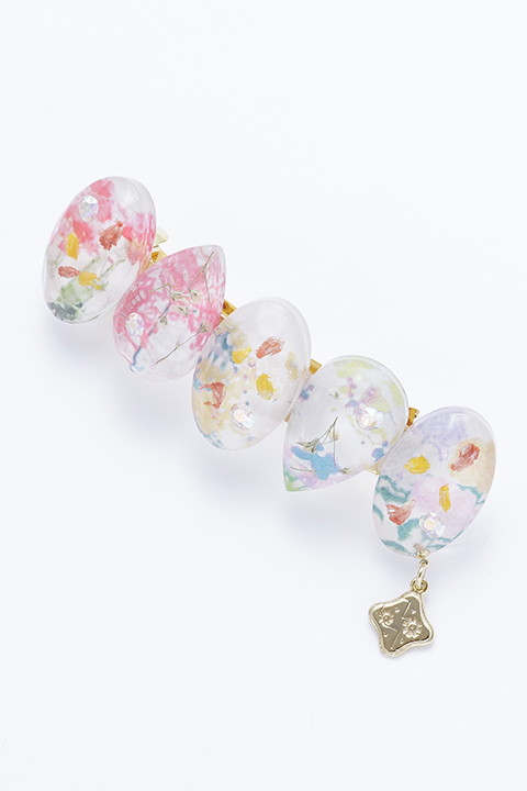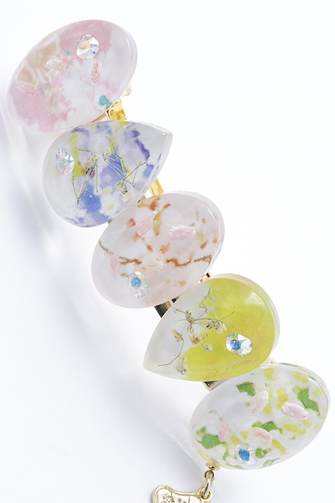 バレッタは、コロンとしたまる×しずく型の組み合わせが可愛いデザイン。1人1人のモチーフフラワーをイメージしたお花が埋め込まれた透明感あるアイテムが、いつものスタイルに華やかさをプラスしてくれる。