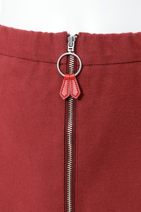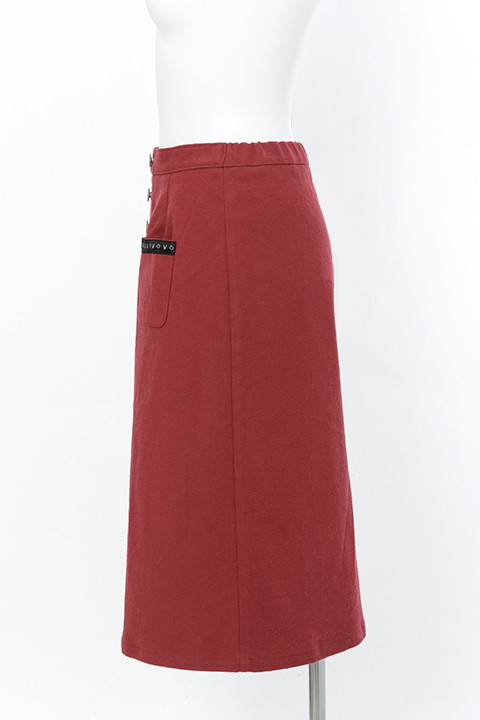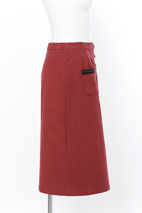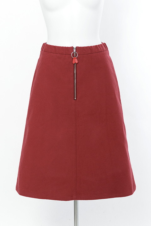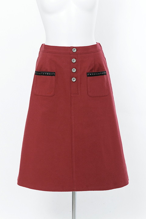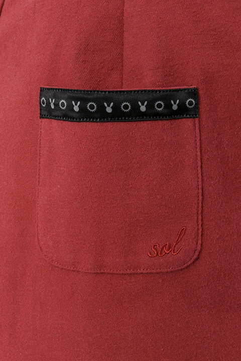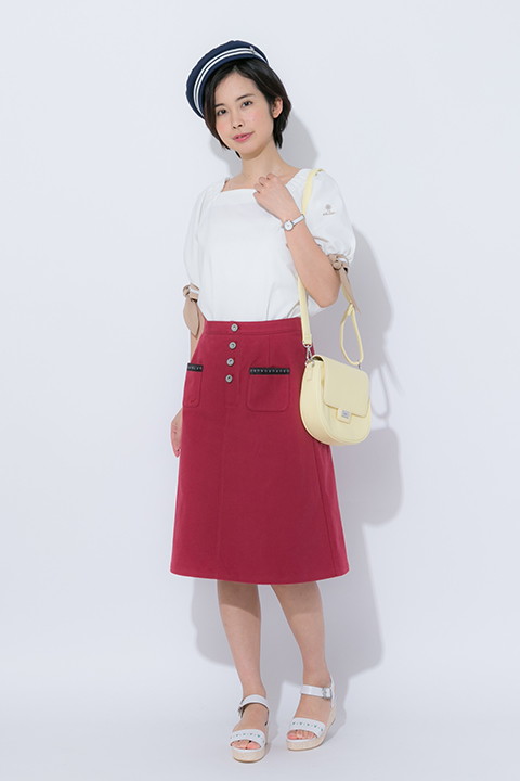 スカートの鮮やかなレッドが目を引く色合い。ポケットには太陽とうさぎや、ファンクラブ名のsolの刺繍がデザインされている。