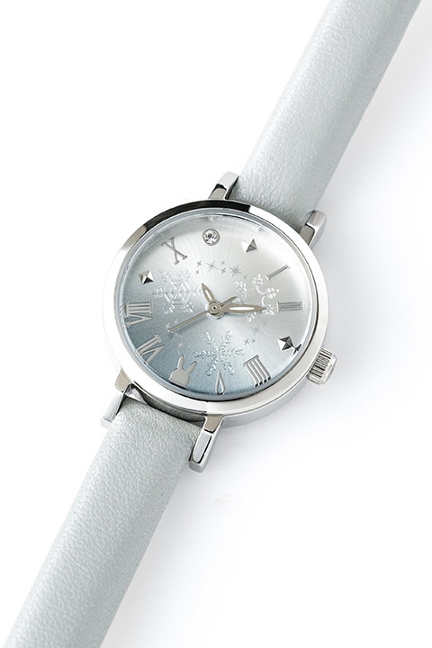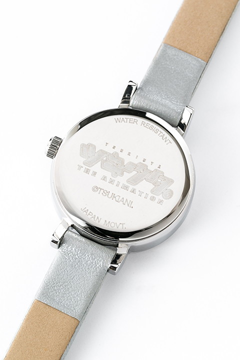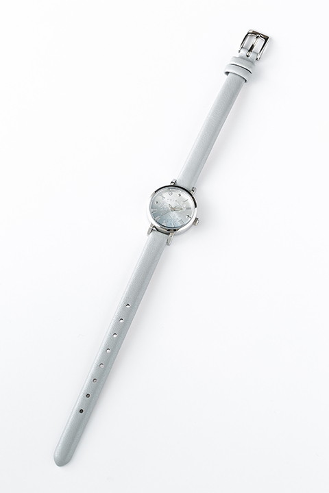 グレーのベルト×シルバーケースがクールでスタイリッシュなデザイン。11時のインデックスにはキャラクターカラーのストーンがあしらわれている。