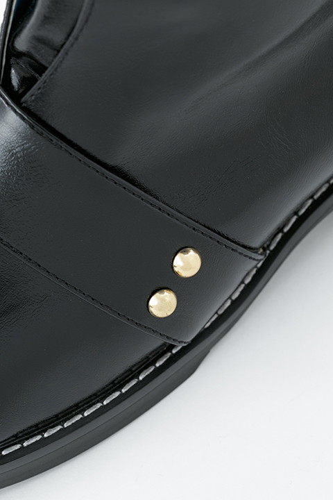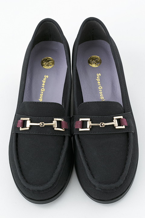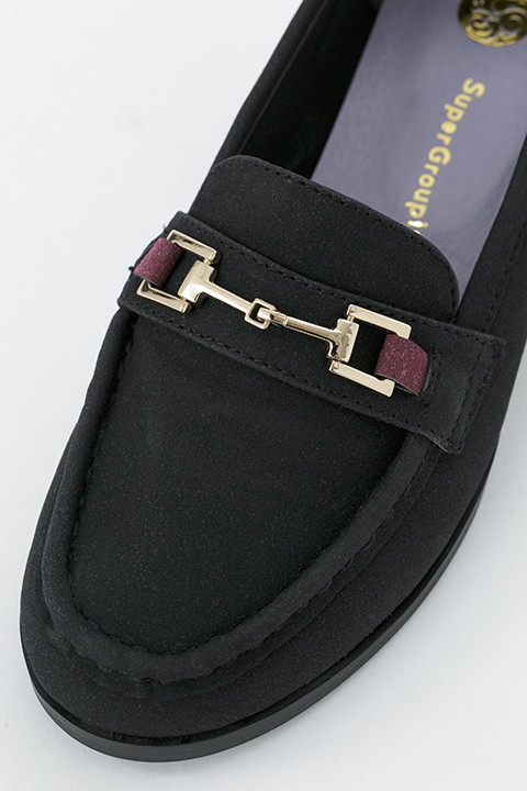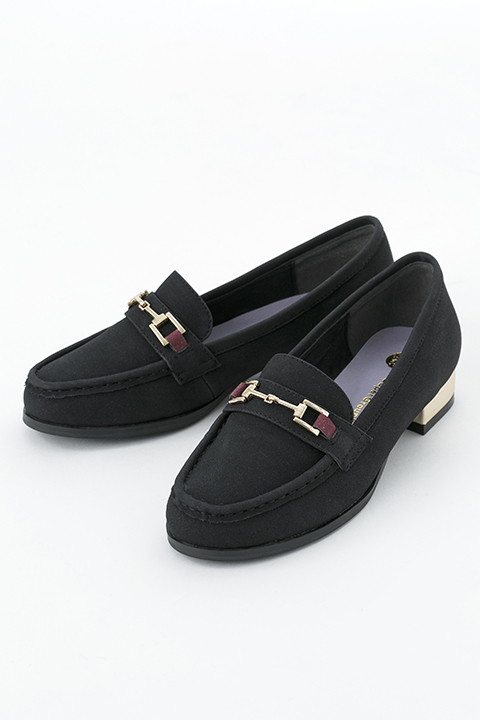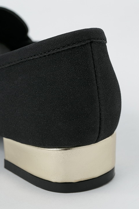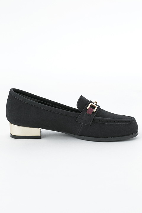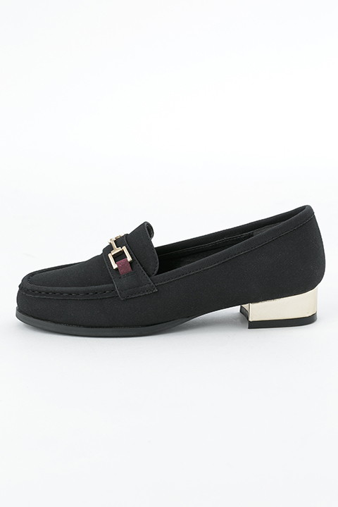 ブラックベースにゴールドのメタルパーツがアクセントのローファーパンプス。歩くたびにチラリと見えるゴールドのヒールが上品な印象をプラスしてくれる。