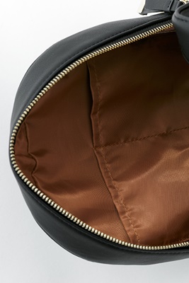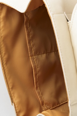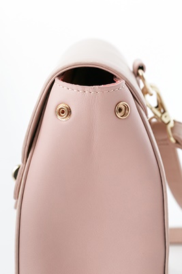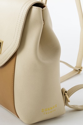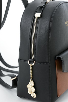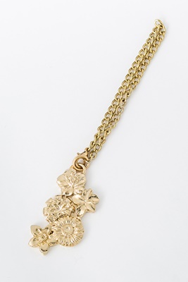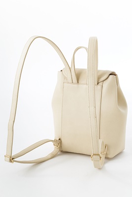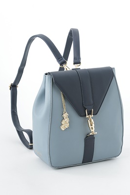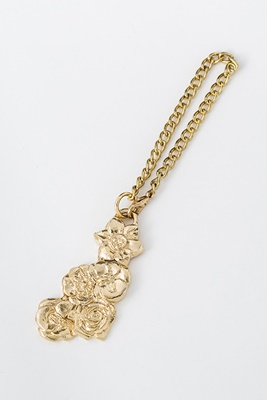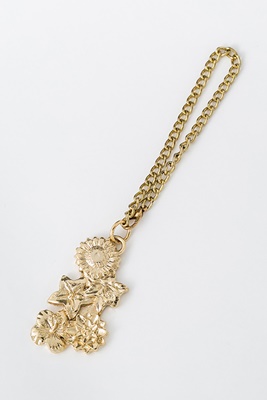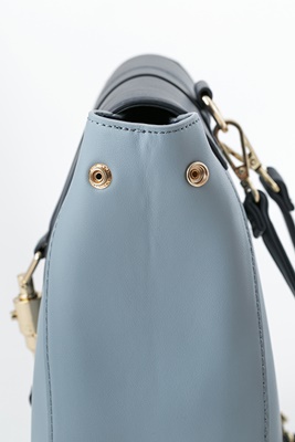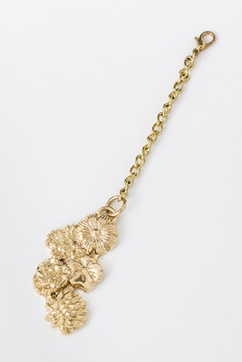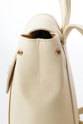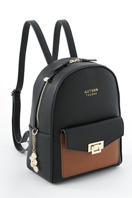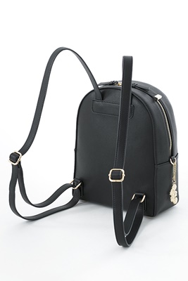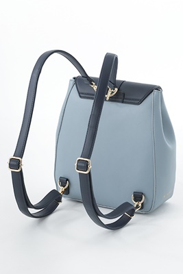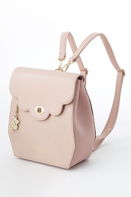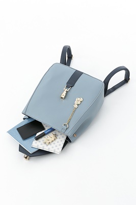 リュックのフラップを留める珍しいタイプの金具がポイント。ペールブルーやゴールドの金具が大人っぽさをプラスしている。紬、丞、密、誉、東のモチーフフラワーを組み合わせたチャームが付属する。