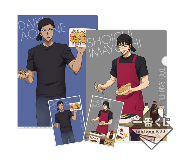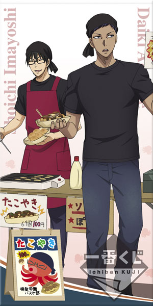 桐皇学園高校は『たこやき屋』がテーマ。お客さんを呼び込む青峰大輝と、たこやきを作る今吉翔一をデザインしています。