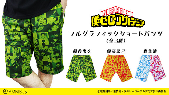 『僕のヒーローアカデミア』より、フルグラフィックショートパンツの登場。緑谷出久、爆豪勝己、轟焦凍がヒーローを目指すきっかけを描いた「緑谷出久:オリジン」、「爆豪勝己:オリジン」、「轟焦凍:オリジン」のシーンを使用し、キャラクターカラーと合わせたデザイン。