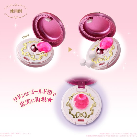 色は、ケースの内蓋はリボンモチーフは従来の仕様からゴールド箔仕様に、ケース下部はミニチュアリータブレット第1弾のクリスタルスターと比べて、少し色味を抑えたパール入りのベビーピンクに変更されている。
