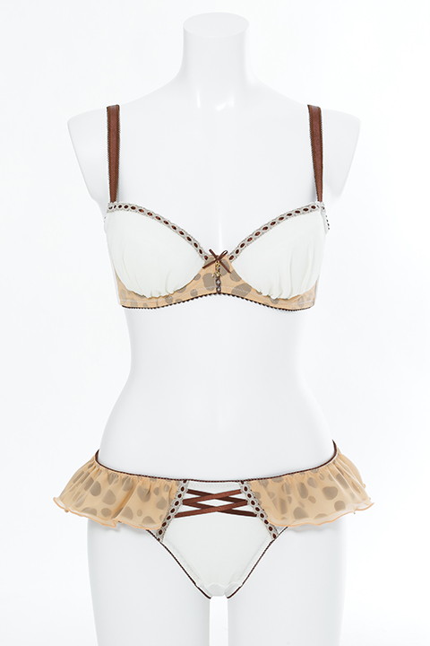 衣装モチーフの柄が入ったカップの中央には、頭の“M”模様をイメージしたチャームが! ショーツはサーバルのスカートをイメージしたシフォンのフリルに、フロントのクロスデザインを表現したとってもキュートなアイテムに仕上がっている。