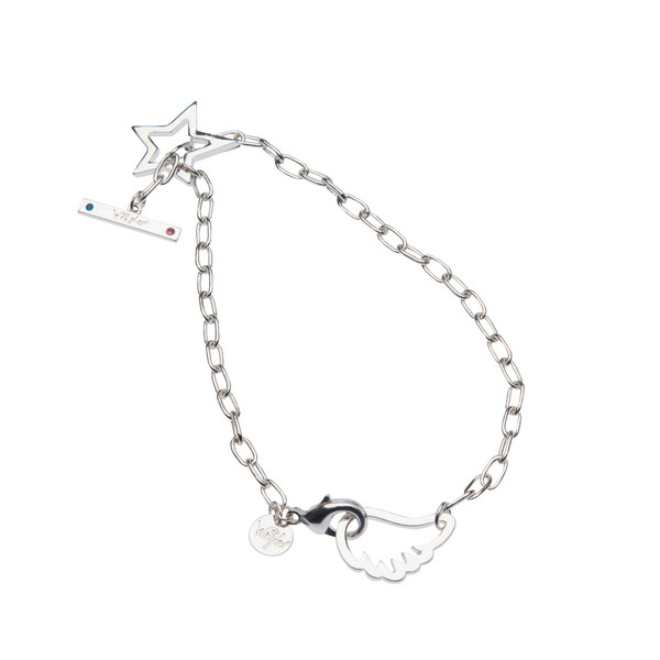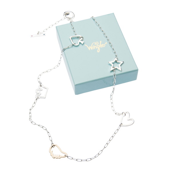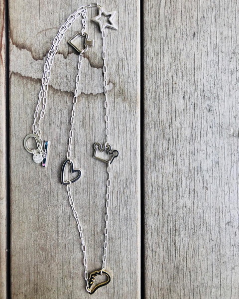 全てのモチーフが付いたロングネックレス。通す穴を変えれば長さの調整も可能。翼モチーフだけゴールドなのもポイント。