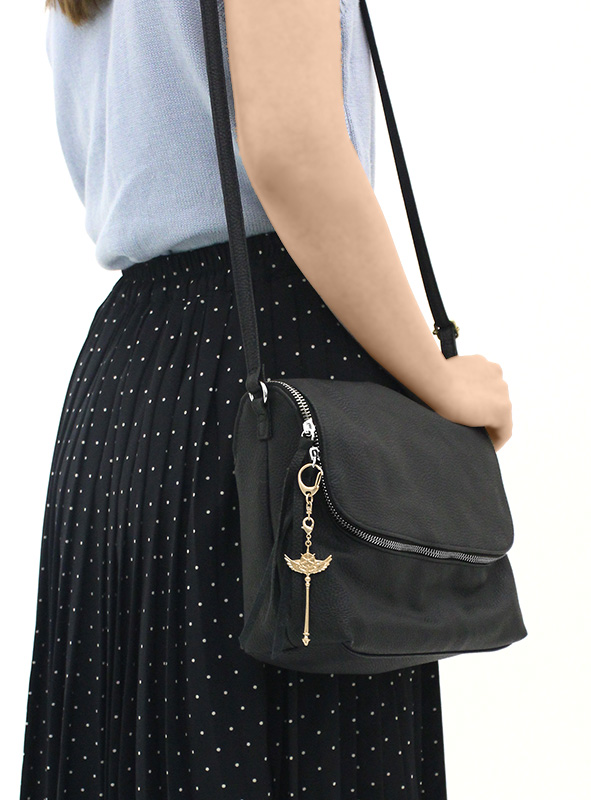 本商品は、さくらの夢の杖をモチーフにしたチャームキーホルダー。手の平サイズのキーホルダーは、素材が金属製と満足感があり、色味も落ち着いたアンティーク調に仕上がっている。幅広い年齢がもち歩きやすい、大人っぽくも可愛いキーホルダーだ。