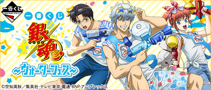 『一番くじ 銀魂~ウォーターフェス~』が、8月11日より書店、アニメイト、アニメガ、ホビーショップ、ゲームセンター、ジャンプショップなど(店舗によりお取り扱いのない場合や発売時期が異なる場合があります。なくなり次第終了。)で発売されている。価格は1回620円(税込)。