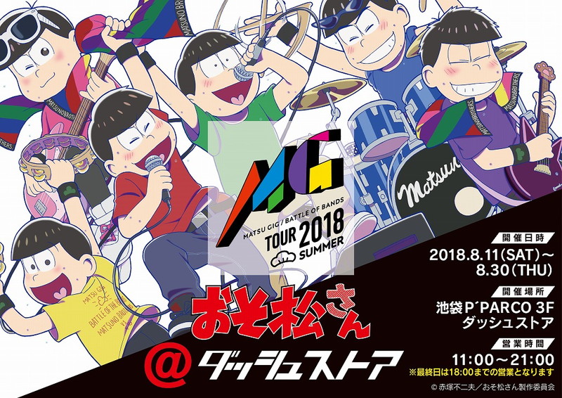 TVアニメ『おそ松さん』が、池袋P’PARCOの“ダッシュストア”に登場。“MATSU GIG/BATTLE OF THE BANDS TOUR 2018 SUMMER”と題し、バンドを楽しむ描き下ろしイラストを使用した限定グッズが販売される。
