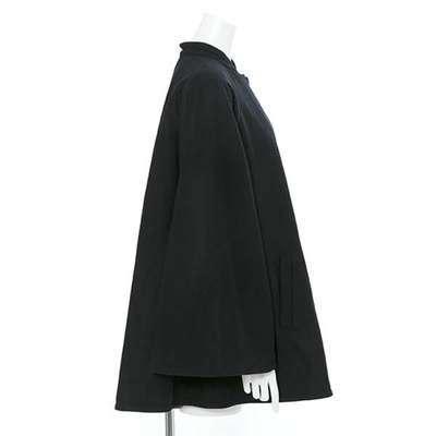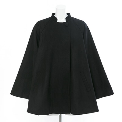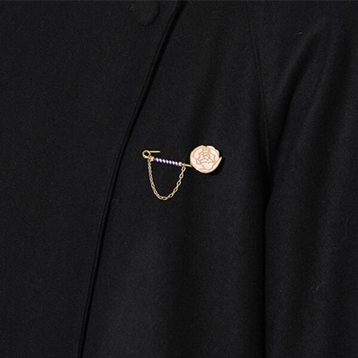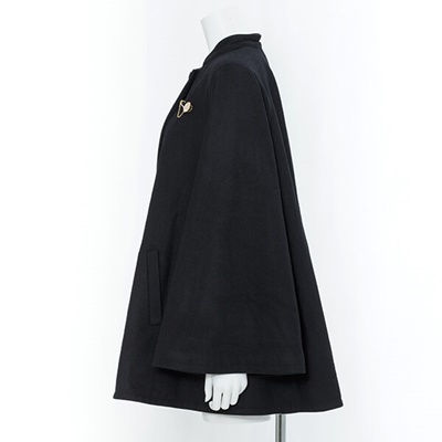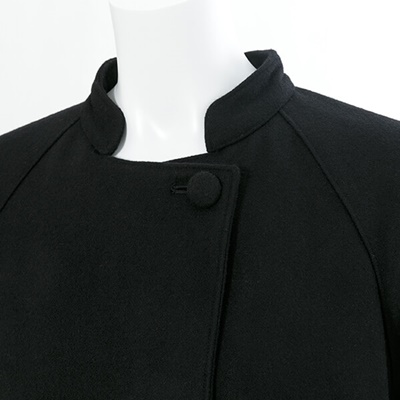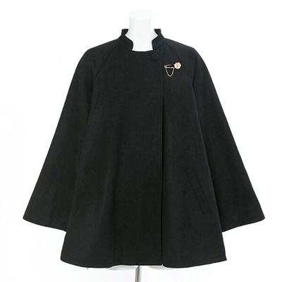 羽織りをモチーフにしたエレガントなブラックのコート。付属のストールピンは、胸元をイメージした牡丹と飾り紐のモチーフ。