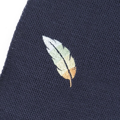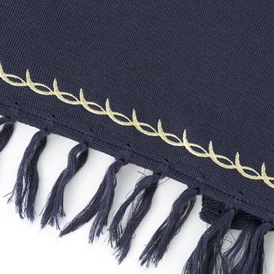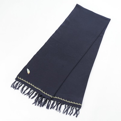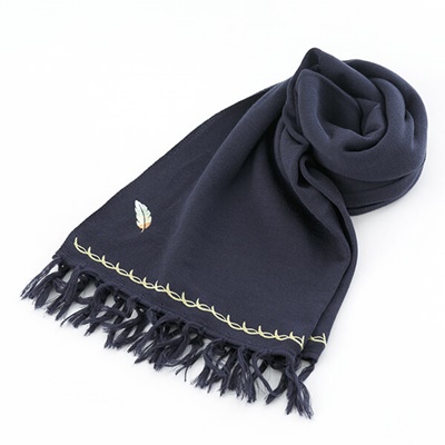 羽織りをモチーフにした、デイリーユースにぴったりなネイビーのストール。裾のモチーフと、髪や胸元にあしらわれた羽の飾りを刺繍でデザイン。