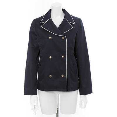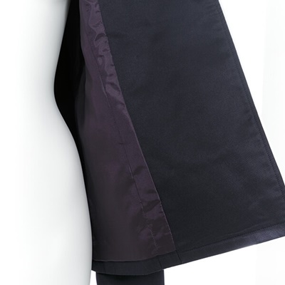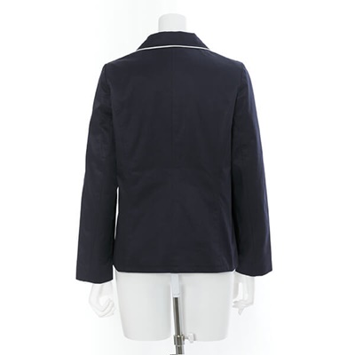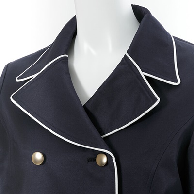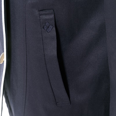 服装をイメージしたネイビーのアウター。ポケット部分には甲冑の紐をイメージした刺繍をさり気なくデザイン。