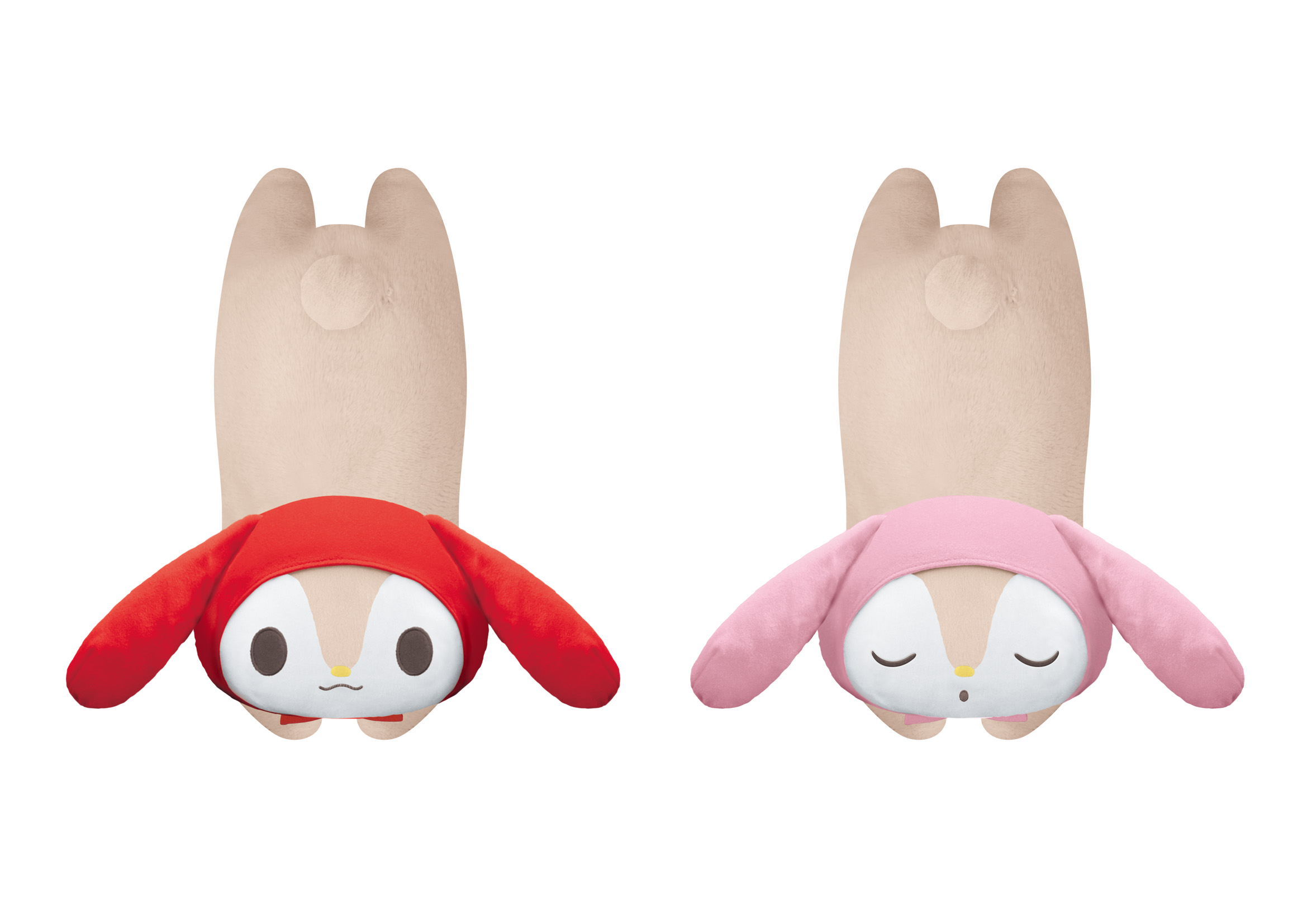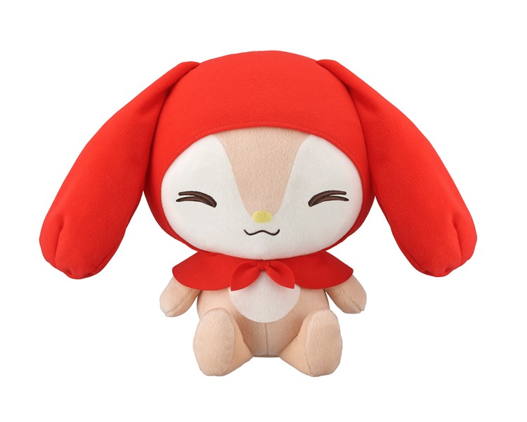 リラックスした姿もかわいいめろぉが、約34cmのぬいぐるみに。ピンクのずきんは初お披露目。