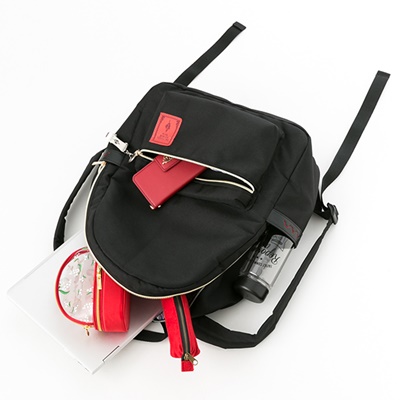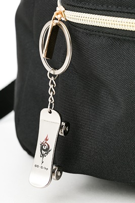 バックルのモチーフがインパクトのある伏見猿比古モデルは、ハンドバッグとショルダーバッグで使える2WAYタイプ。ブラックでまとめた八田美咲モデルは、コーディネートを選ばないシンプルなカジュアルリュック。スケボーチャームが付属する。