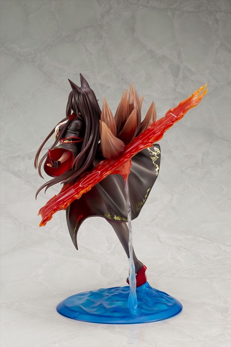本商品は、存在感のある九尾や上半身の造形など細かい部分まで忠実に再現。戦闘海域をイメージしたベースや甲板、長く美しい髪はクリアパーツ成形を活かし、光に透ける美しい仕上がりとなっている。またコトブキヤショップで購入すると限定特典として、“指揮官様への微笑み顔パーツ”が付属する。