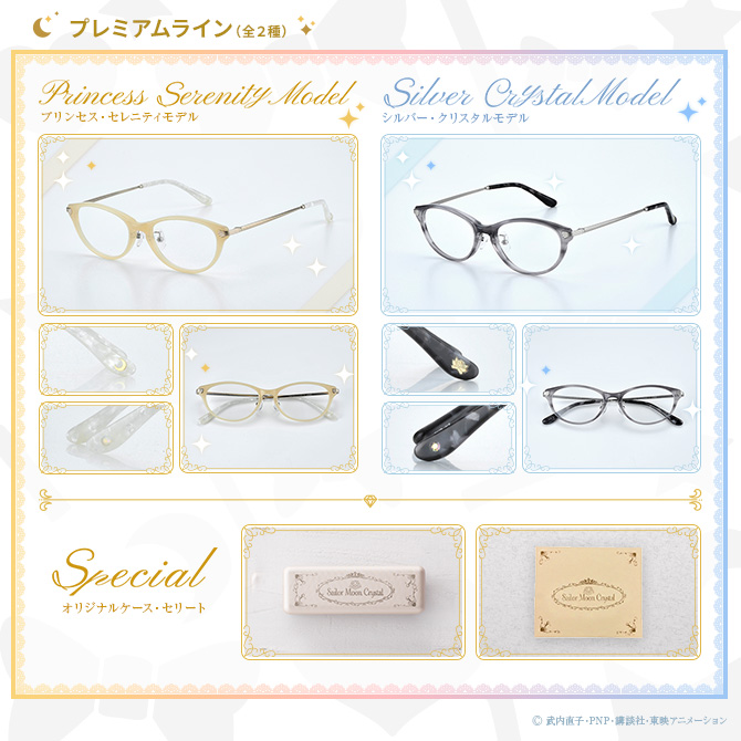 プリンセス・セレニティモデルは、プリンセス・セレニティがまとうドレスをイメージしたアイボリーのカラーリングで全体をデザインしており、メガネの先にあしらわれた月のマークとスワロフスキーがプリンセスらしさを演出しています。そして幻の銀水晶をモチーフにしたシルバー・クリスタルモデルは、グレーのフレームとシルバーのつるを採用、メガネの先に銀水晶とスワロフスキーをあしらい聖なる輝きを表現しています。細部に施された華やかな装飾によって、女性らしさが際立つデザインに仕上げました。