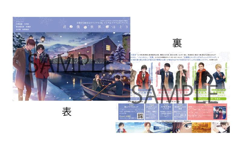 PONY CANYON×GINGER BERRYが贈る、音楽から始まるオリジナルBLソング&ドラマCDシリーズ『君と僕と世界のほとり』より、12月19日に発売される『Phrase1 ふたりぼっちクリスマス』のジャケット写真が公開。さらに、CDに収録されるエンディング楽曲『初恋コントラスト』の試聴動画も公開された。