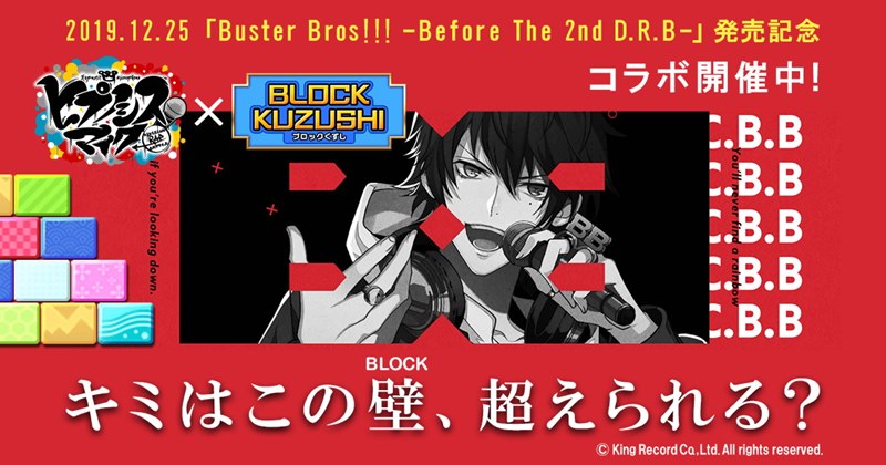 ひとつめはゲームとのコラボ企画で、“BLOCK KUZUSHI × ヒプノシスマイク”。本CDの1曲目に収録される山田一郎(CV.木村昴)の楽曲『Break the wall』に因んでおり、Buster Bros!!!の3人のシルエットがランダムで登場し、ステージをクリアすると姿を現す仕様となっている。