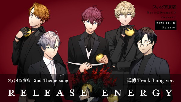 現在『スパイ百貨店 Music&Drama CD Order#2』の主題歌として収録される「Release energy」のロングバージョンの試聴も公開中。無機質さをまとった、ミステリアスなEDMナンバーを、マミヤ(CV:住谷哲栄)、ユリト(CV:坂田将吾)、ナグモ(CV.河西健吾)、フウマ(CV.:竹田海渡)、カイト(CV:八代拓)の5名が歌っている。