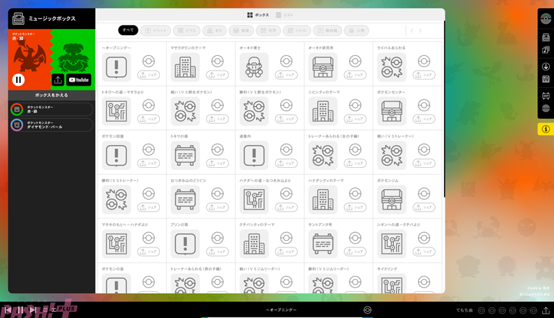 本サイトでは、1996年2月27日に発売された『ポケットモンスター 赤・緑』や2006年9月28日に発売された『ポケットモンスター ダイヤモンド・パール』のBGMや効果音、全194曲を無料で聴くことができます。お気に入りの6曲を選択して、あなただけの“てもち曲”を作成し、SNSにシェアすることも可能です。