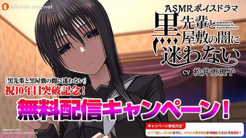 KADOKAWAは、自作ゲーム投稿サイト・ゲームアツマールで46万超プレイの人気インディーズゲーム『黒先輩と黒屋敷の闇に迷わない』を原作とする『ASMRボイスドラマ 黒先輩と黒屋敷の闇に迷わない』の無料配信キャンペーンを“mimicle(ミミクル)”にて実施中です。
