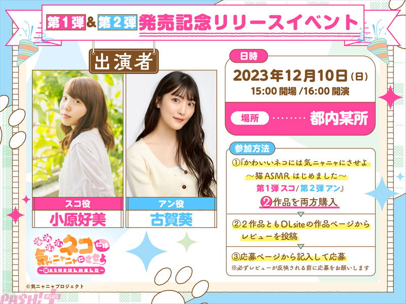 『かわいいネコには気ニャニャにさせよ~猫ASMRはじめました~』初となるリリースイベントが2023年12月10日(日)に開催決定。DLsiteにて第1弾『スコ(CV:小原好美)』と第2弾『アン(CV:古賀葵)』の両方を購入し、両方の作品ページからユーザーレビューを投稿し、第2弾『アン(CV:古賀葵)』の作品ページ上にある応募フォームから応募いただいた方の中から抽選で無料でご招待。本イベントにはスコ役の小原好美、アン役の古賀葵が出演し、ここでしか聞けない本作の魅力や収録時のエピソード、猫ASMRにちなんだ内容のコーナーを行う予定です。
