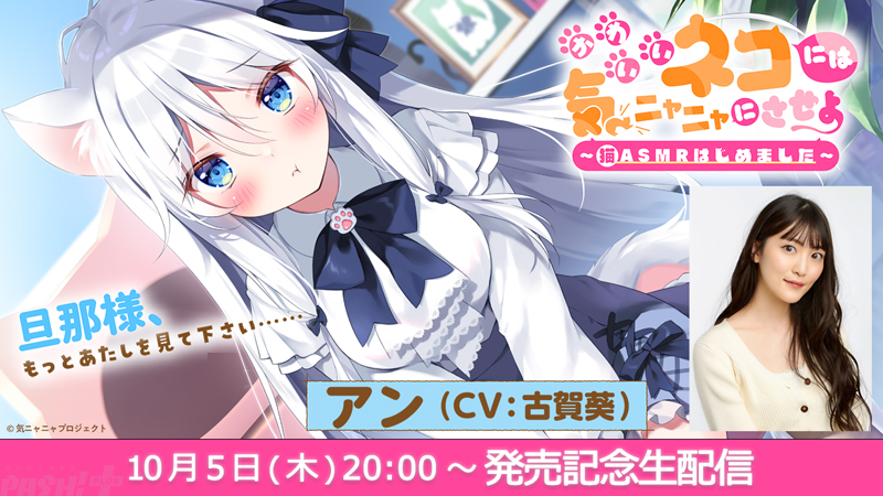 『かわいいネコには気ニャニャにさせよ~猫ASMRはじめました~ アン(CV:古賀葵)』の発売を記念し、生配信を2023年10月5日(木)20時から『かわいいネコには気ニャニャにさせよ~猫ASMRはじめました~』の公式X(Twitter)のツイキャスにて行います。生配信にはアン役の古賀葵さが出演し、作品の内容や最新情報について語ります。