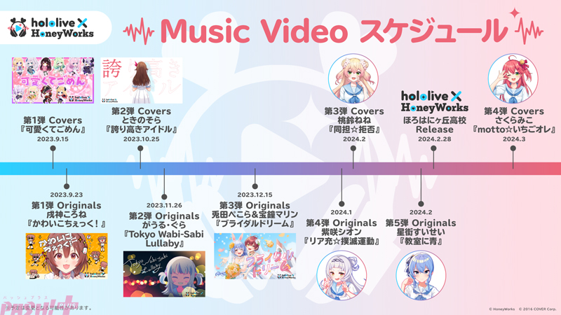 hololive × HoneyWorks(ホロハニ)のMusicVideo公開スケジュールを一挙公開! 既に配信されている5曲に加え、各アルバムに収録される計4曲を公開予定。