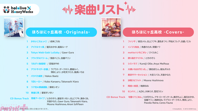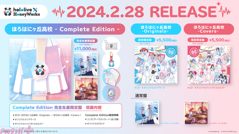 ホロライブタレントはもちろん、HoneyWorksとしての新しい一面も楽しめる新規書き下ろし楽曲を含む全11曲を収録した「ほろはにヶ丘高校 -Originals-」と、原曲とはまた違ったホロライブならではの魅力をHoneyWorksの名曲11曲に詰め込んでカバーした「ほろはにヶ丘高校 -Covers-」のアルバム2枚のリリースが決定しました。