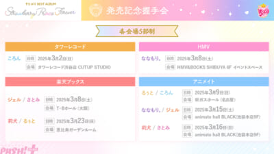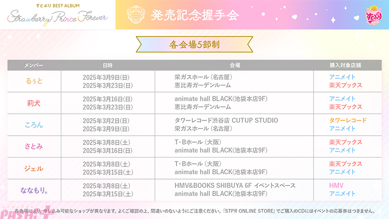 すとぷりの音楽と、6人が歩んできた日々を振り返りながら、これからも続いていく新たな旅路を感じられるこのアルバムは、リスナーにとってもメンバーにとっても特別な1枚になること間違いなし。また、すとふぁみ限定盤、初回限定盤にはすとぷり初の“60分”を超える超大作「Strawberry Prince Dreaming Parade」限定映像作品フィルムライブがベストアルバムの特典として収録。さらに、ベスト盤発売を記念した握手会も実施されます。
