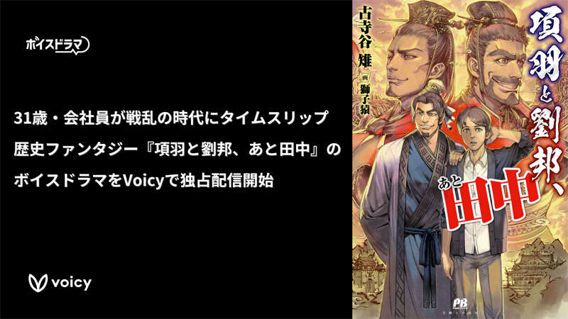 『項羽と劉邦、あと田中』は、主人公の会社員・田中が秦王朝末期の中国にタイムスリップ。営業で培った弁舌を活かして楚漢戦争に臨む、歴史ファンタジー小説。マンガ化もされた人気作品です。この度、主婦と生活社と連携し、Voicyのオリジナルボイスドラマとして独占配信されます。