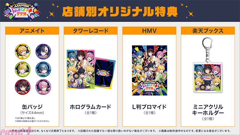 アルバムのリリースを記念して、東京、名古屋、大阪での発売記念握手会の開催が決定いたしました! お好きなメンバーを選んでお申し込みください。全国アニメイト(通販を含む)にて、「AMPTAK×レインボーロード中77%」(通常盤、初回限定盤)をご予約(全額内金)もしくは、ご購入いただいたお客様にイベントにお申し込みいただける応募シリアルをお渡しいたします。なお、応募方法等の詳細およびアニメイトイベントページ、クラブアニメイト応募ページは2025年3月9(日)公開予定です。