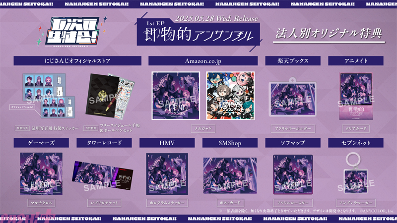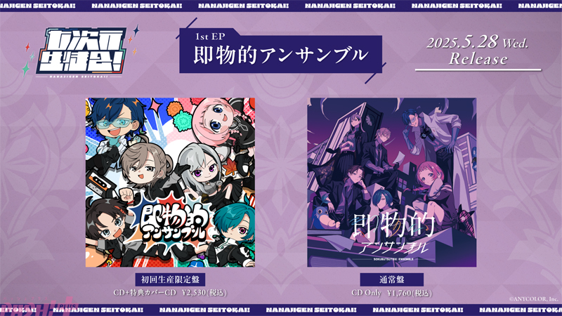 ANYCOLORが運営するVTuber/バーチャルライバーグループ「にじさんじ」は、樋口楓、叶、仙河緑(緑仙)、三枝明那、レオス・ヴィンセント、周央サンゴによるユニット「七次元生徒会!」による1st EP『即物的アンサンブル』のジャケット&各法人特典デザインが公開されました。
