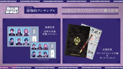 にじさんじオフィシャルストアでは購入特典として「証明写真風 特製ステッカー」、有償特典では「フリースケジュール手帳&ボールペンセット」を用意。「証明写真風 特製ステッカー」はオフショット?Verとの2枚セットとなっています。有償特典「フリースケジュール手帳&ボールペンセット」には手帳・ボールペンに加え、ポップなジャケットビジュアルを使用した手帳用シールも付属。日常的にご利用いただきやすいグッズとなっておりますので、是非この機会にゲットしてみてください。